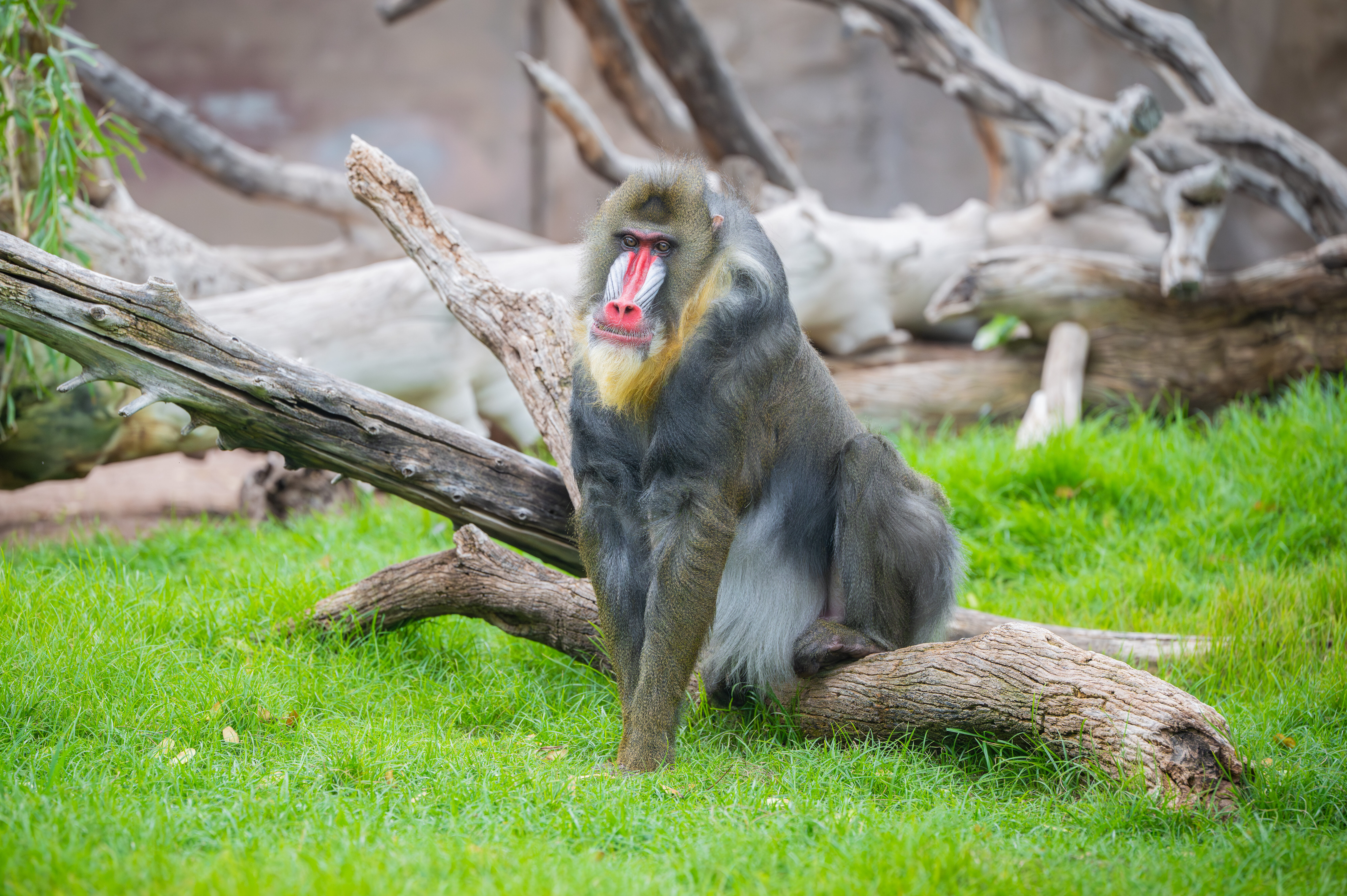 Mandrills can communicate in a variety of ways, including using body language, vocalizations and even smells. Mandrills have sternal glands on their chests that release chemicals, which they rub on tree trunks to mark the area with their scent. It’s usually the males that scent mark, and the most dominant boys sometimes do it so often they end up injuring themselves! Smell can communicate a lot of things without the animal even being in the area. One study compared the chemicals secreted by individual mandrills, and the researchers found that mandrills might be able to tell things like age, sex, and male dominance all from smelling a scent mark left behind on a tree.
